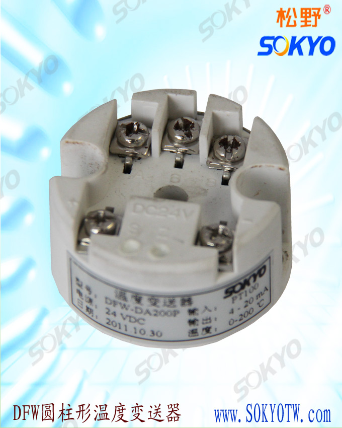 1.产品特点:体积小巧,导轨式安装,方便 2.外形结构:圆柱形结构 3.输出信号:DC 4~20mA 4.电网制式:标准型2线制